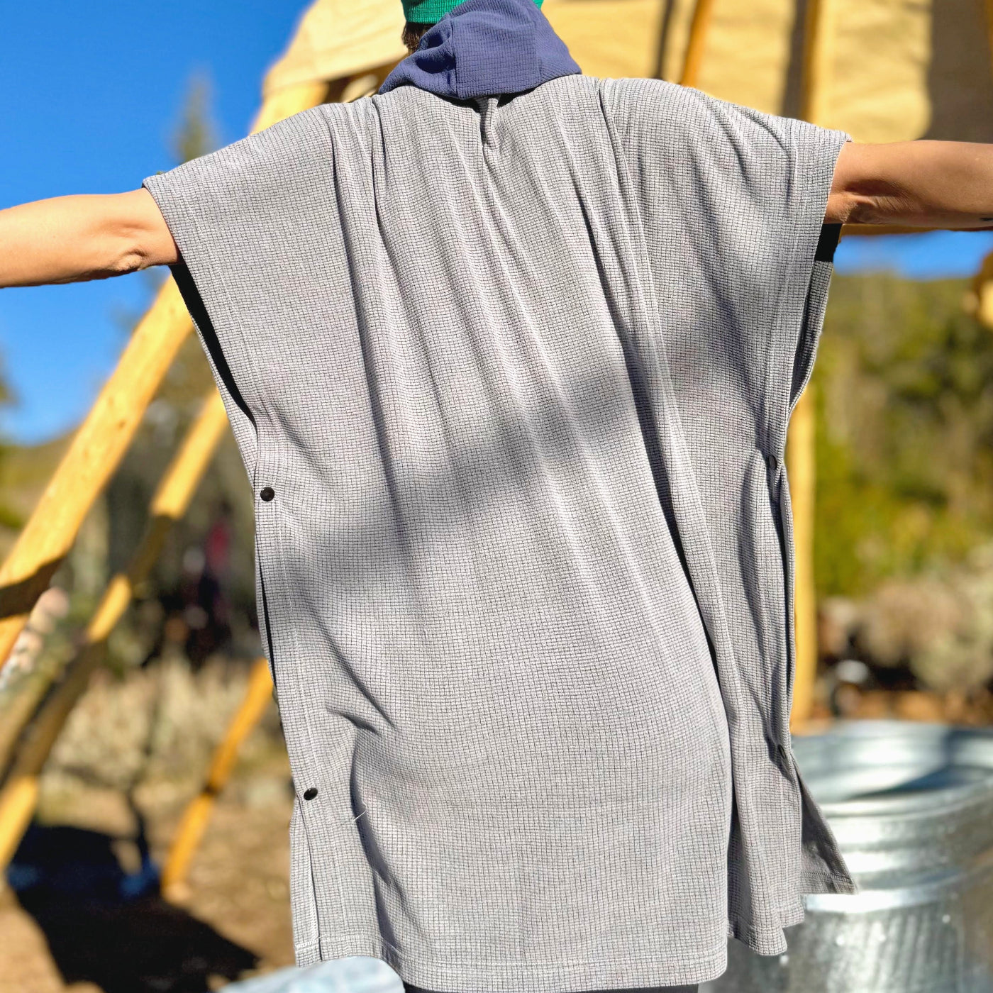 With a relaxed drape and multiple side snaps, this poncho is your trailhead changing room, riverbank wrap-up, campfire cocoon, or lounging layer. The roomy hood (same fit as our classic Camp Hoodie) keeps the chill out, and the oversized kangaroo pocket up front is perfect for stashing cold hands or trail essentials.