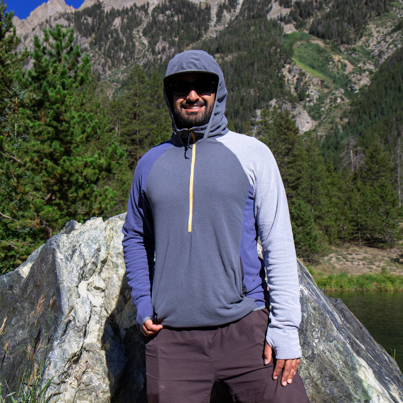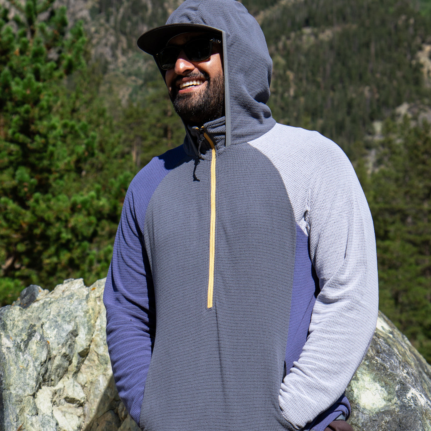 Hood is strategically positioned at the collar's base, to keep it out of the way when you don't need it, but still have the ability to zip up the collar and keep the chill off your neck. The fusion of the zipped collar and the hood with elastic trim offers wind and element protection, creating a comfortable opening for your face.